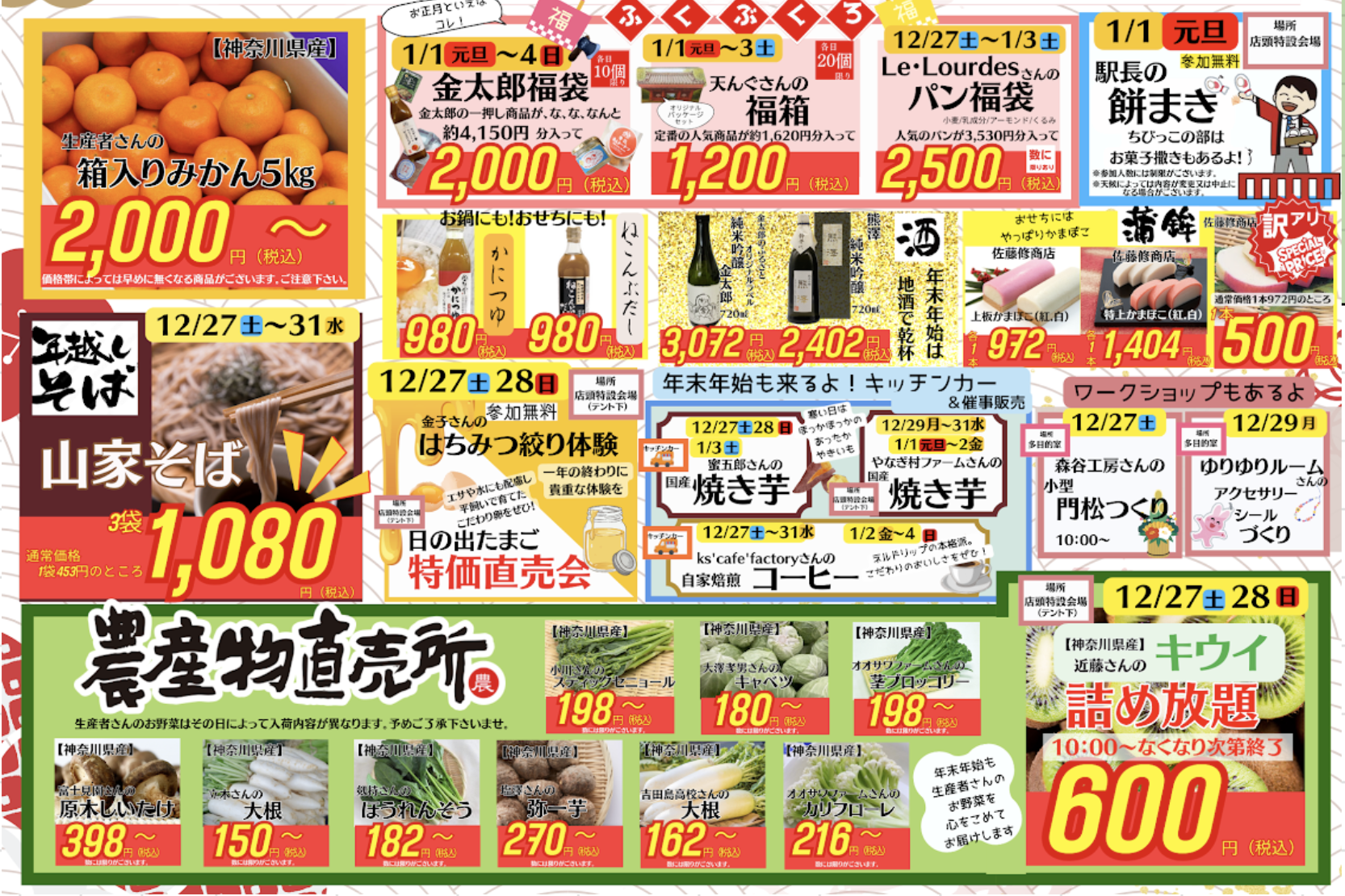 道の駅足柄・金太郎のふるさと(運営:株式会社相州・村の駅、所在地:神奈川県南足柄市)は今年1年のご愛顧に感謝し、また新年のご挨拶も込めて2025年12月27日(土)~2026年1月4日(日)まで「行く年くる年 道の駅足柄・金太郎のふるさと年末年始大感謝祭」を開催します。今回のイベントでは、人気商品が集まったお得な福袋や、生産者さんのお野菜の特売、お正月飾りのワークショップやはちみつ絞り体験などを開催します。さらに、やまゆりポークや自然薯をつかった新メニューも登場!数々の体験を通して、南足柄や神奈川県の魅力に触れることができるイベントをもりだくさんにご用意しています。