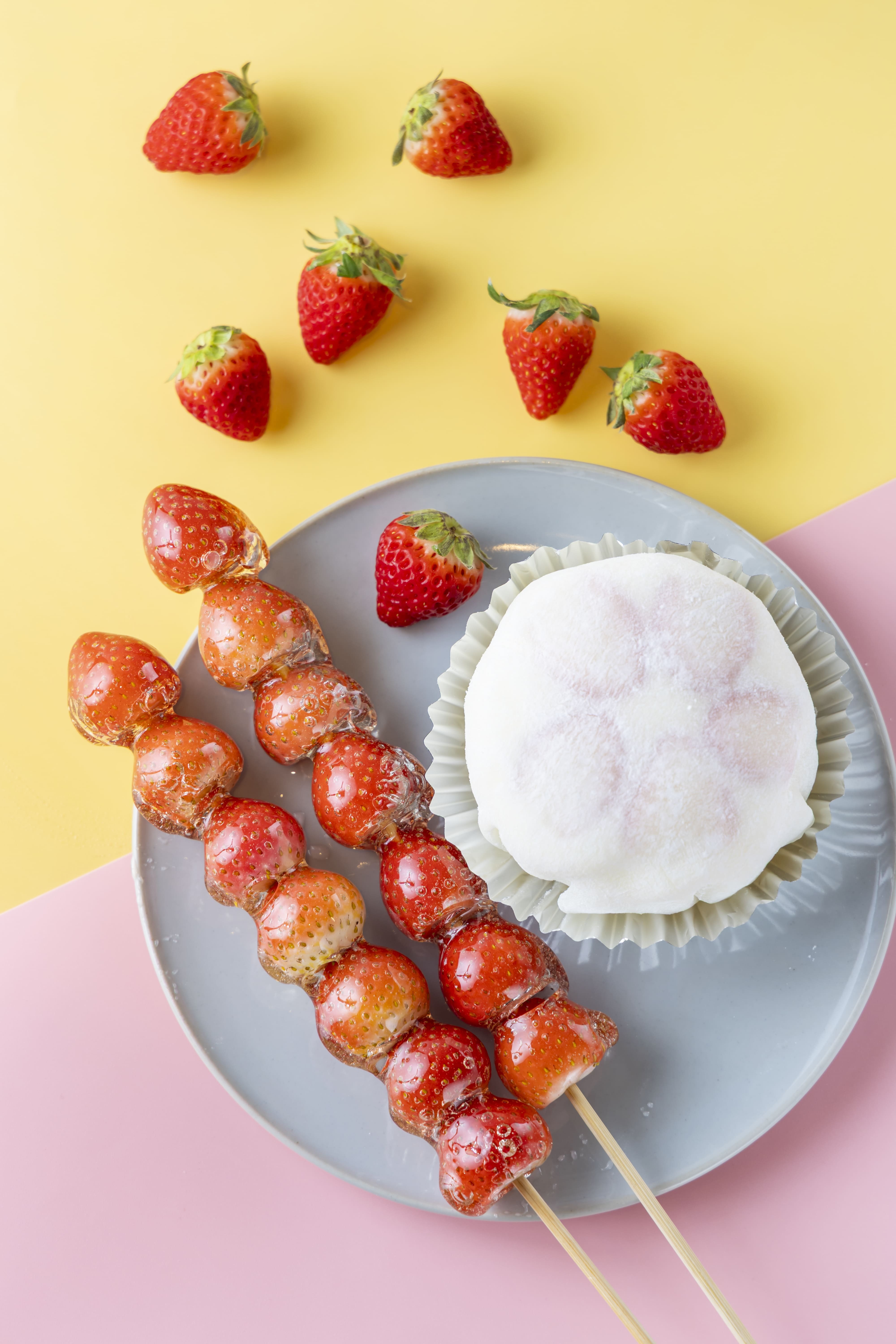 店内中央ショーケース/物販コーナーでは、定番の「いちごあめ」と「いちごのショートケーキ大福」の2種が限定仕様に!たっぷり楽しめる「7粒いちごあめ串」と、直径約9cmの特大サイズ「1.7倍!!!いちごのショート大福」として登場いたします。