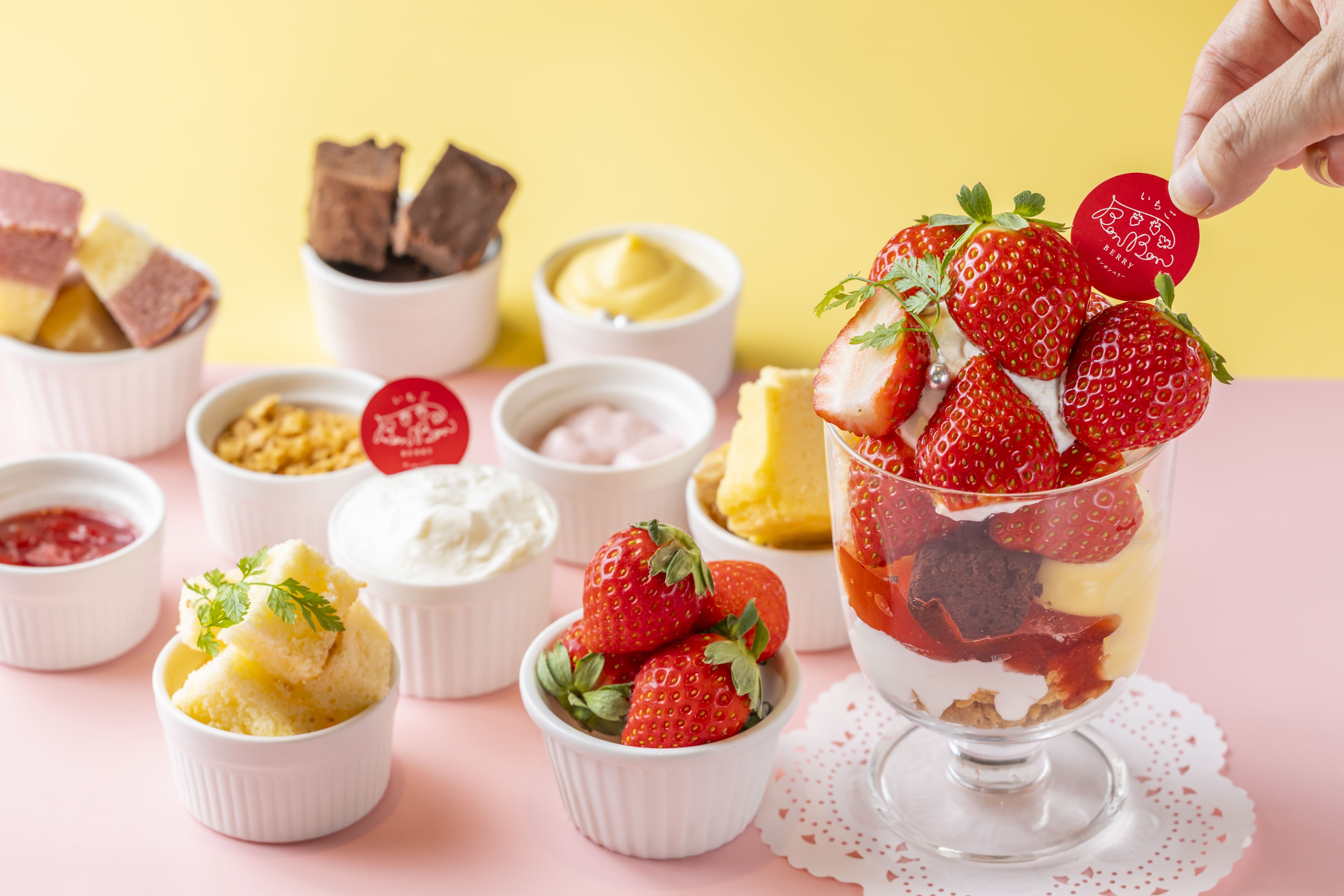 いちごや、お土産としても人気の「いちごのバウムクーヘン」、スポンジ、クリームなどをグラスに自由に盛り付けるだけなので、お子さまにもお楽しみいただけます。