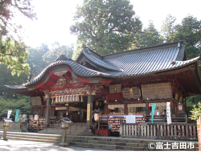 富士山の世界遺産の構成資産の一つであり、富士吉田を代表する由緒ある神社。1900年以上の歴史があり、日本武尊(やまとたけるのみこと)が東方への遠征の折にこの地で富士山の神霊を遥拝し、「富士の神山は北方から拝せよ」と仰せになり、祠を建てて祀ったのが始まりとされている。拝殿の左右には樹齢約1000年を数える「冨士太郎杉」と「夫婦ヒノキ」のご神木がそびえ、本殿を始め境内11棟の建造物は国の重要文化財に指定されている。