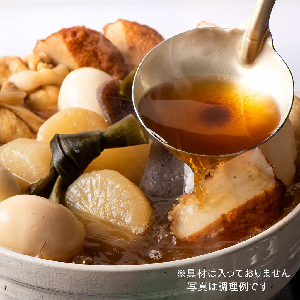 かつおだしの豊かな風味と濃厚な旨みを存分に堪能できる、じんわりと染み入るような奥深い味わいのおでんです。久世福商店の看板商品「風味豊かな万能だし」を丁寧に抽出し、すっきりとした上品な味わいを引き出します。さらに久世福商店オリジナルの香り高い白だしと、「風味豊かな万能だし」の粉末をあわせることで、かつおの香りと強い旨みをもつ極上のつゆが完成しました。