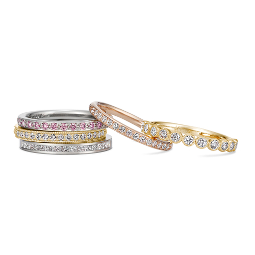 結婚記念日に贈るアニバーサリージュエリー。 15ピースのダイヤモンドの輝きを、結婚指輪に重ね着けて