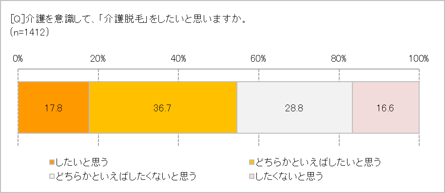 介護脱毛をしたい人は54.5%。その理由としては、「老後の準備としてチャレンジしたい」(40代・専業主婦)、「介護する側、される側、どちらも気持ちよくいられそう」(60代・専業主婦)など、前向きにとらえ、介護する側の負担を減らしたいと考えている人が目立ちます。年代別にみると、若い人ほど「したい」「どちらかといえばしたい」という割合が高く、20代では81%という結果に。実際に介護脱毛(VIO脱毛)をしている人からは、「においなどの不快感がなくなり、つねに清潔」(30代・専業主婦)、「生理中の蒸れ、かぶれがなくなった」(40代・フルタイム)など、生理時の快適さに満足している人が多く見られました。一方「したくない」も45.5%と半数近くいて、理由としては「自然のままでいい」「施術に抵抗感がある」「費用が高い」などがありました。また、介護脱毛の意味を、「介護する側の都合で脱毛されること」と勘違いしている人も。介護脱毛は、あくまで自分の意志で自分のアンダーヘアを脱毛することであり、決して強制されるものではありません。