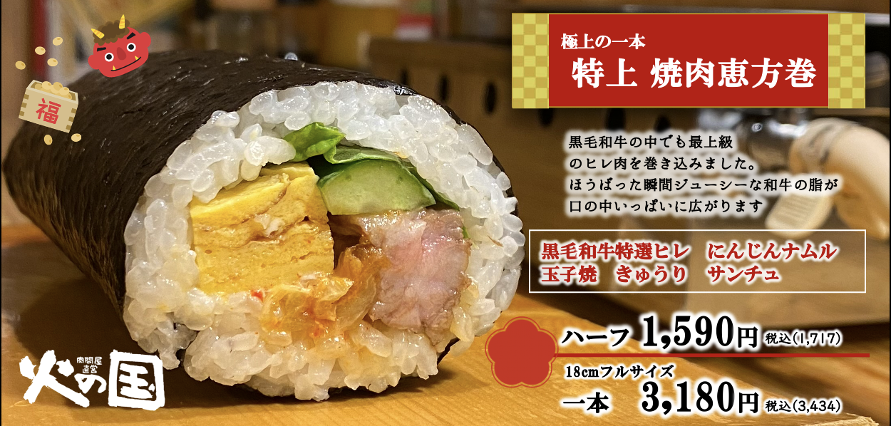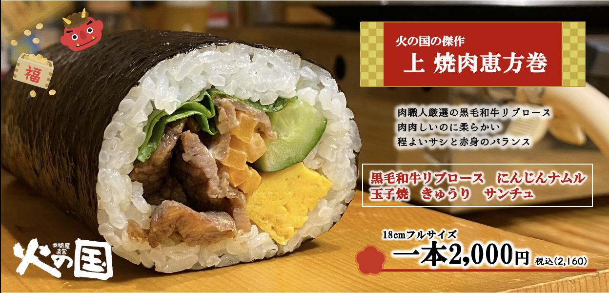 浜松で11店舗の飲食店を展開する株式会社ランドマーク(本社:静岡県浜松市、代表取締役:森 幸太郎)が【炭火焼肉火の国】で3種類の肉恵方巻きを新発売!2025年1月20日より予約受付開始いたしました。受け渡し日は、2月1日(土)2日(日)です。今年の節分は2月2日!恵方は西南西!お馴染みの職人の玉子焼きやシャキシャキとした新鮮なお野菜を詰め込みました。ご飯は新潟から直送のコシヒカリ。海苔はもちろん有明産の香りの良い海苔を使用しております。