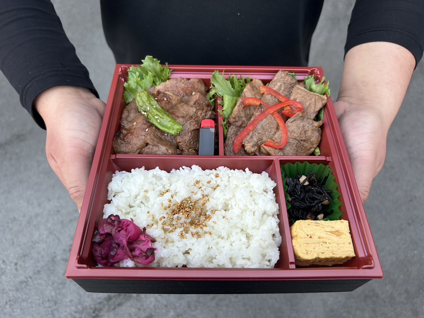 上カルビやリブロースなど、その日の上物部位2種類の黒毛和牛を乗せたボリュームあるお弁当です。