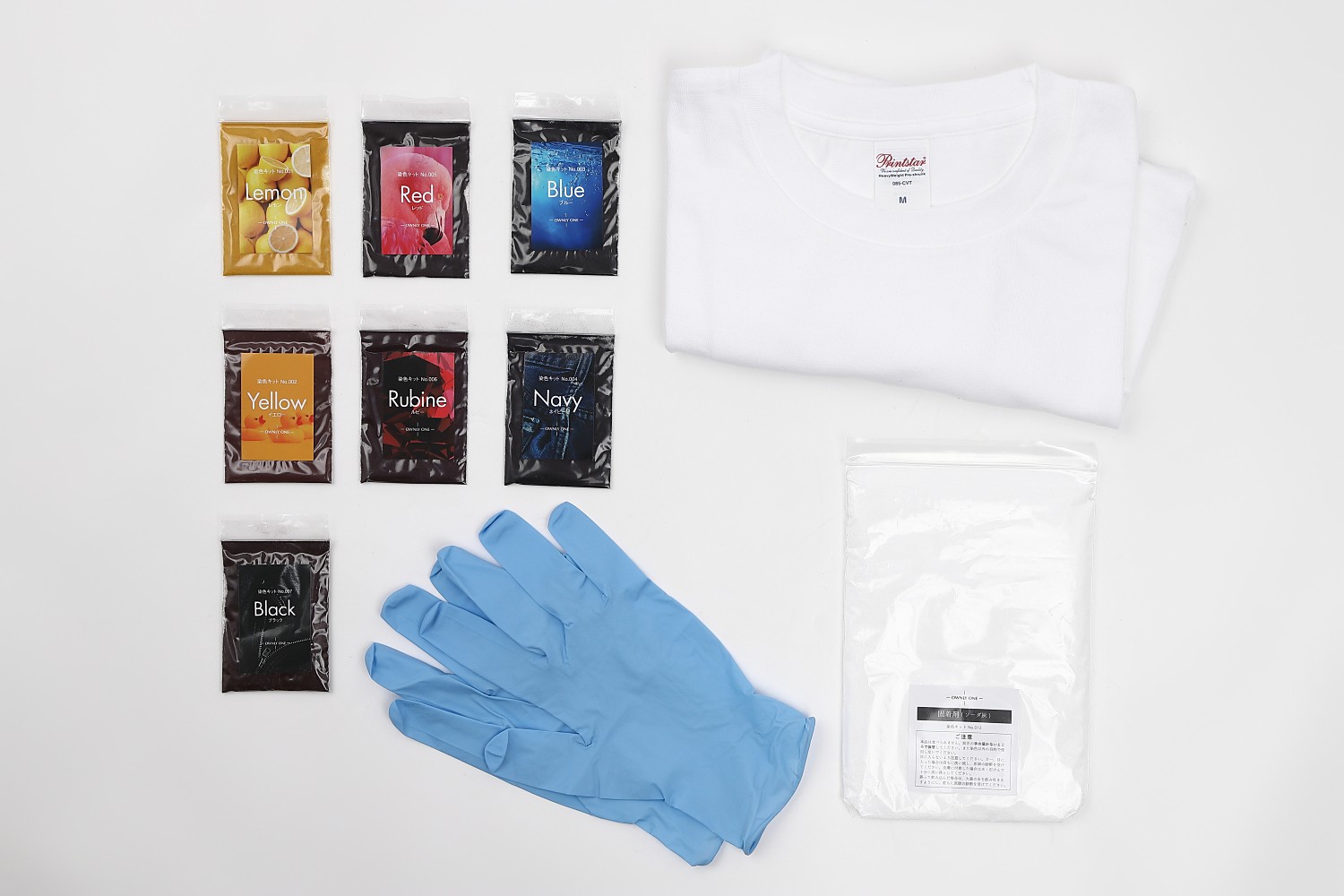 キットには、実際の染色工場で使用される高品質な反応染料を採用。発色と堅牢度に優れているため、鮮やかな発色と洗濯にも強い仕上がりが特長です。Tシャツは国内企業の後染め用ボディを採用し、縫製糸まで綿100%のため、色ムラが出にくく美しく染まります。