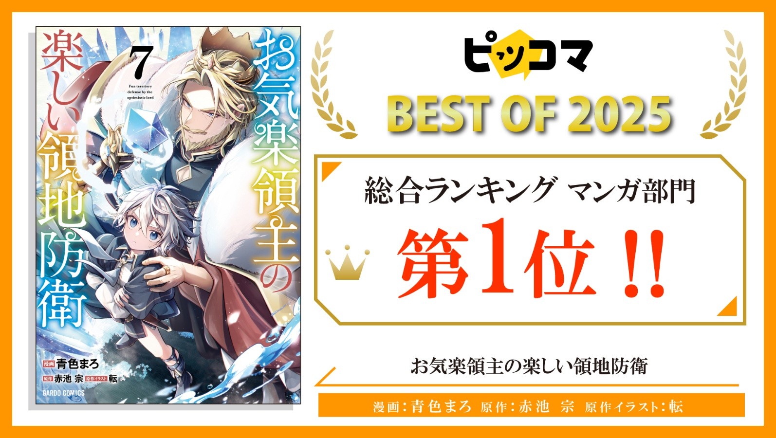 株式会社オーバーラップ(代表取締役社長:原田 直樹、所在地:東京都品川区)は、株式会社カカオピッコマ(本社:東京都港区、代表取締役社⻑:金在龍)が運営する電子マンガ・ノベルサービス「ピッコマ」が運営する電子マンガ・ノベルサービス「ピッコマ」において、2025年に最も読まれた作品の年間ランキング『ピッコマ BEST OF 2025』にて、コミック「お気楽領主の楽しい領地防衛」をはじめとする自社出版作品7タイトルがランクインしたことを発表しました。