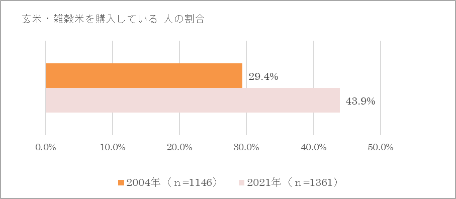 今回の調査で、「玄米・雑穀米に興味がある」人の割合は89.1%と非常に高く、実際に玄米・雑穀米を購入している人も43.9%で半数近くいました。2004年調査の29.4%と比べると、なんと14.5ポイントも玄米・雑穀米を購入している人がアップしています。少し前まで「ヘルシーだけど堅くて食べにくい」というイメージがあった玄米や雑穀米ですが、思った以上に食卓に浸透しているようです。