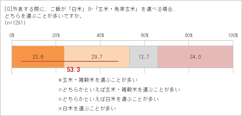 今回の調査では、「もっと玄米・雑穀米を食べる頻度を増やしたい」(74.0%)という思いがあるのに対し、「家族がいやがる」(40代・フルタイム)、「夫が白米のほうが好き」(30代・フルタイム)、「子どもには、堅くて食べにくいみたい」(30代・専業主婦)など、家族が好まないというコメントも目立ちました。また、「家で玄米を炊くと給水時間が長かったりして手間がかかる」(20代・専業主婦)、「自宅の炊飯器では、玄米を上手く炊けない」(50代・フルタイム)などの理由で、自宅では玄米を炊かないという人も。その影響か、「週3日くらい外食でのランチで食べている」(30代・パート)、「外食でごはんが選べるときは玄米にする」(50代・パート)のように、外食では玄米・雑穀米を選ぶ人が半数以上の53.3%に上りました。
