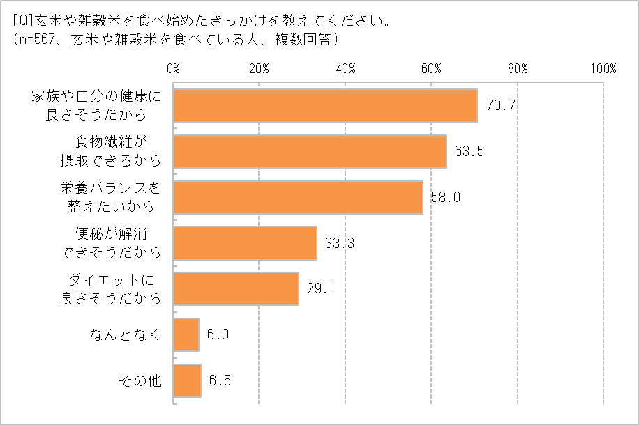 玄米・雑穀米を食べはじめた理由は、1位「健康によさそう」70.7%、2位「食物繊維が摂取できる」63.5%、3位「栄養バランスを整えたい」58.0%と、健康を意識した回答が上位に。実際に、「どうせ食べるなら栄養素が多いものを食べたい」(50代・フルタイム)、「主食を玄米・雑穀米にするだけで、ビタミンがとれるのがいい」(50代・自営)など、玄米・雑穀米の栄養を期待しているコメントが寄せられました。