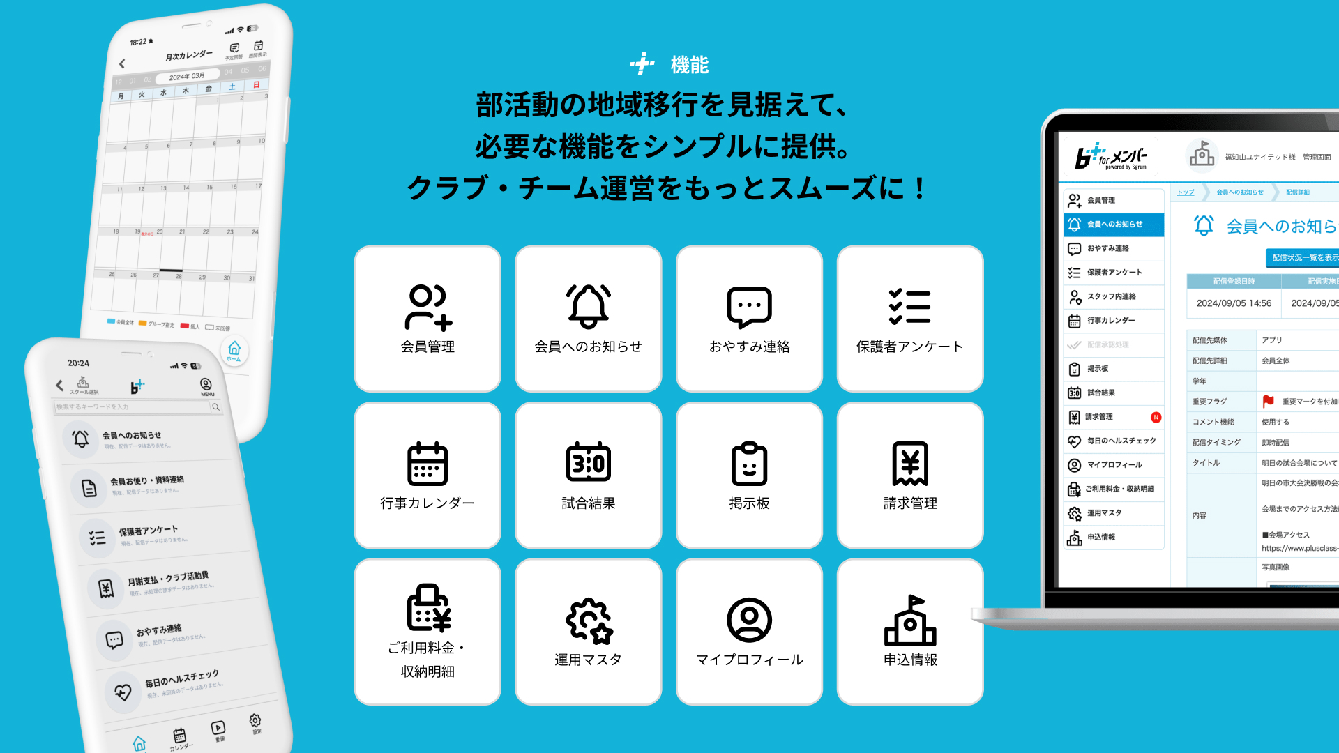 プラスクラス・スポーツ・インキュベーション株式会社(所在地:東京都千代田区、代表:平地 大樹、以下 PSI)の部活動移行支援事業「ブカツプラス」が部活動の地域移行によるクラブ運営を見据え、2023年9月に業務提携を開始したSgrumを運営する株式会社ユーフォリア(所在地:東京都千代田区、代表取締役:橋口 寛、宮田 誠)の協力のもと、生徒の出欠管理や連絡網、月謝支払いなどを簡単に実現するアプリ「b+(ビープラス) for メンバー powered by Sgrum(以下 b+ for メンバー)」をリリースいたしました。