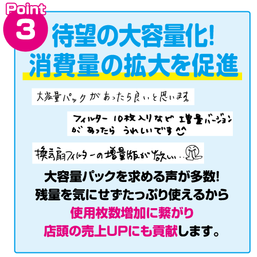 衛生面に対する意識の高まりや換気・掃除の習慣化により、売り上げを伸ばしている人気商品「ホコリとりフィルター換気扇用」は、弊社販売商品売上No.1の実績と使用者の再購入意向98.6%*1という高い満足度を誇ります。この商品は、シールのように貼るだけで、ホコリが溜まったらはがすだけという手軽さが魅力の予防掃除商品です。交換頻度が高いため、お客様のご要望にお応えし、人気の15㎝サイズと30㎝のフリーサイズの入り枚数を3倍にした大容量パックを新発売いたしました。