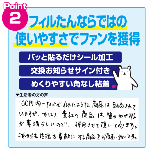 ブランドキャラクター「フィルターの妖精『フィルたん(R)』」がフィルターが汚れると浮かび上がり、交換時期をお知らせしてくれます。「フィルたんのパッと貼るだけフィルター」はデザイン粘着なので交換時期が分かりやすいだけでなく、通気性を損ないにくい安心設計です。