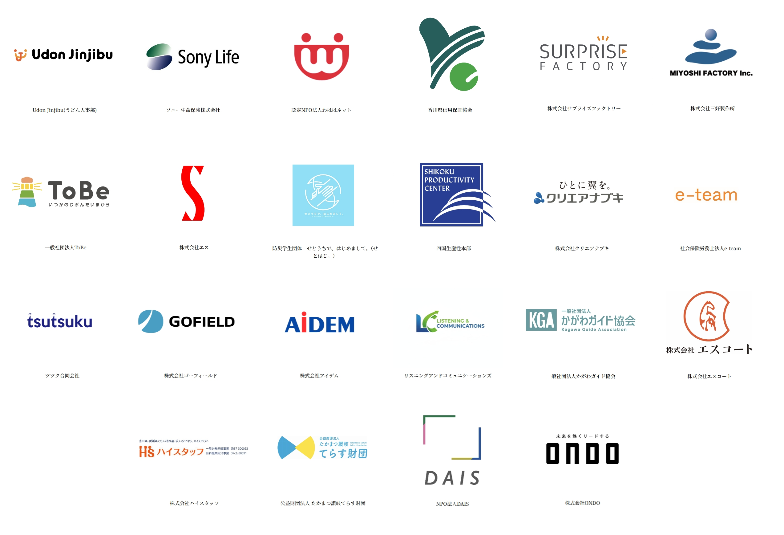 ■ 出展企業(順不同): Udon Jinjibu(うどん人事部) / ソニー生命保険株式会社 / 認定NPO法人わははネット / 香川県信用保証協会 / 株式会社サプライズファクトリー / 株式会社三好製作所 / 一般社団法人ToBe / 株式会社エス / 防災学生団体 せとうちで、はじめまして。(せとはじ。) / 四国生産性本部 / 株式会社クリエアナブキ / 社会保険労務士法人e-team / ツツク合同会社 / 株式会社ゴーフィールド / 株式会社アイデム / リスニングアンドコミュニケーションズ / 一般社団法人かがわガイド協会 / 株式会社エスコート / 株式会社ハイスタッフ / 公益財団法人たかまつ讃岐てらす財団 / NPO法人DAIS / 株式会社ONDO