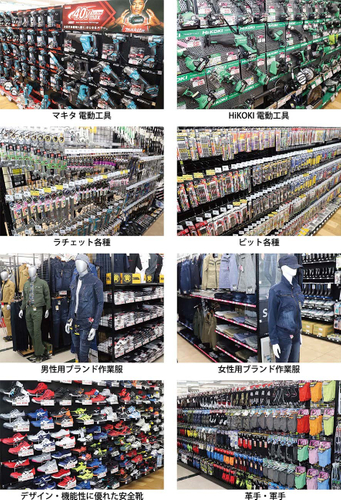 2号店は、1号店で培ったノウハウとエッセンスを凝縮し、今後の多店舗展開も見据えた新フォーマットでの出店となります。品揃えにおいては、建築・建設・土木・鳶・大工の業種をターゲットとした専門的な深い品揃えで、主に工具・作業服に特化・注力してまいります。