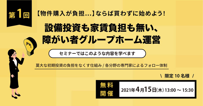 株式会社インデンコンサルティング(本社:京都市中京区)が運営する「まるなげセミナー」は、2021年4月15日(木)13時〜15時半に『 買わずに始めよう!500~1500万円の初期費用を抑えられる!障がい者グループホーム運営セミナー』を開催いたします。