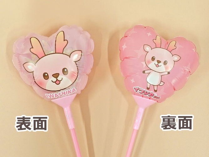 イワシカちゃんをデザインした、スティック付きのハート形バルーン。ラメ入りなので振るとキラキラと光を反射し、シャカシャカと音が鳴ります。