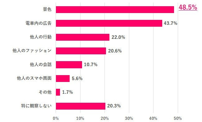 通勤中に観察してしまうものを聞いたところ、「景色」48.5%、「電車内の広告」43.7%が半数近くいました。一方で「特に観察しない」も20.3%いることがわかりました。