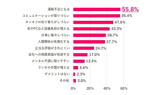 一方で、リモートワークのデメリットとして過去の同調査では、「運動不足になる」(55.8%)、「コミュニケーションが取りづらい」(55.4%)を問題視する声が多数を占めました。