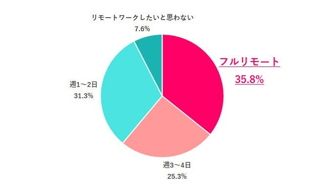 リモートワークはどの程度したいか聞いたところ「フルリモート」35.8%が最も多く、「週1~2日」31.3%が続きました。「リモートワークしたいと思わない」7.6%は、少数派でした。