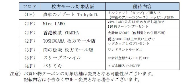 ・枚方モール:お買い物クーポン(5枚)
