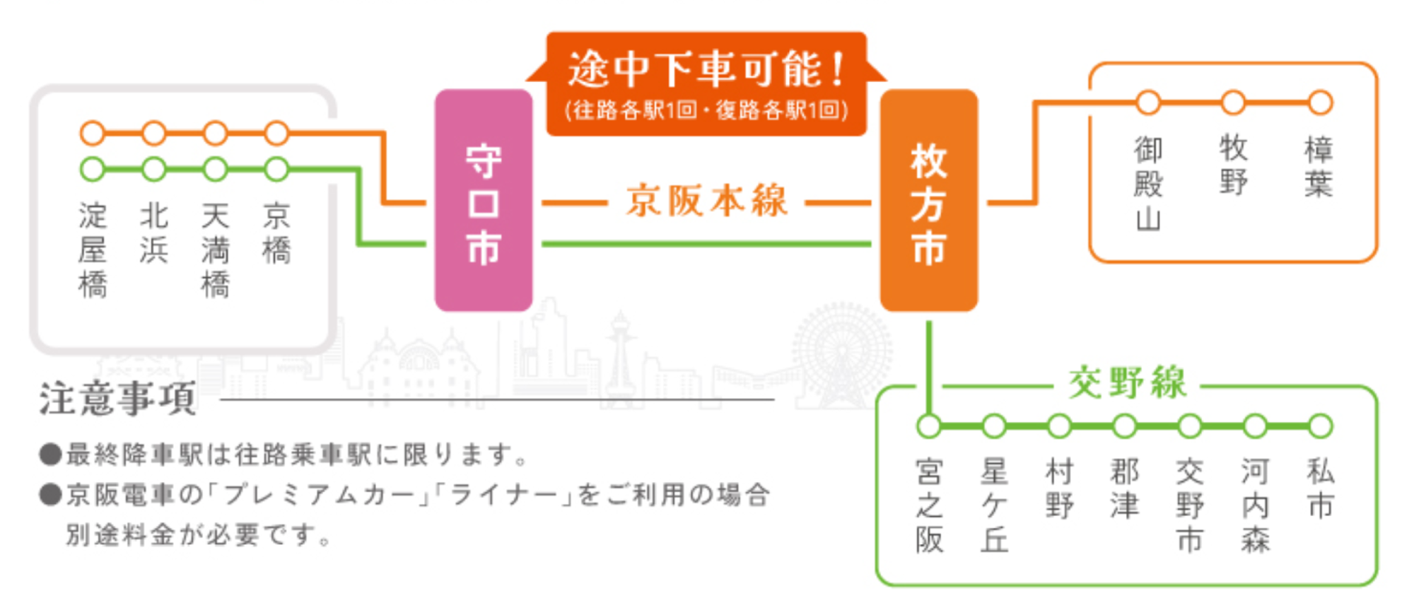 ・枚方市駅と守口市駅のみ途中下車可能
