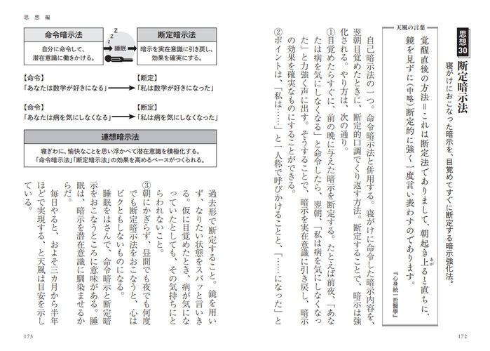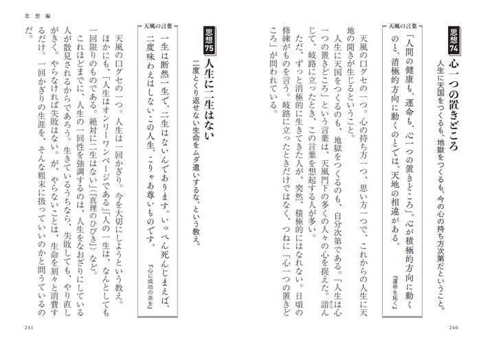 日露戦争時の元帥・東郷平八郎はじめ、昭和平成を代表する名経営者・稲盛和夫など、直接、間接に中村天風から影響を受けたとされる人物は多く、最近では、メジャーリーグで活躍する大谷翔平選手が中村天風の著作『運命を拓く』を愛読していたことで、改めて注目されています。本書は、天風はどんな生涯を生き抜き、どんな影響を与えたかを解説する「生涯編」と、天風はどんな思想や哲学を説いたかを解説する「思想編」の2部構成に分け、天風のすべてをコンパクトに紹介します。中村天風の名前は知っているけれど、これまで著作は読んだことのない方にとっての「初めての1冊」として、また、これまで数冊読んだことはあるが、もっと体系的に天風哲学を把握したい方の「学びなおしの1冊」としてぴったりの事典です。