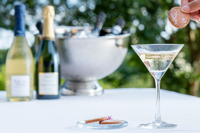 Auberge フレンチの森の「Grand Baobab」では夏の期間限定で、ファーストオーダーにグラスシャンパーニュ又はノンアルコールのスパークリングワインをご注文いただきましたお客様に限り、華やかなで香り豊かなバラ色のスイーツであるビスキュイをプレゼント。サクサクとした食感のビスキュイをシャンパーニュに浸すと泡のシュワシュワ感とビスキュイの塩味が一体となり、遊び心を刺激する 一杯となります。