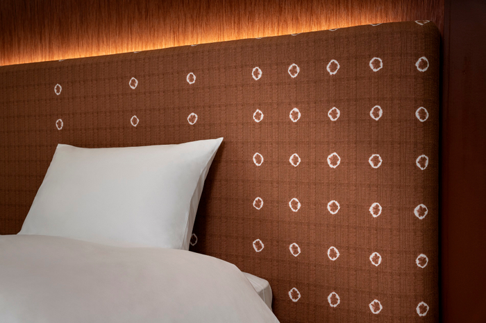 客室は全70室がご当地部屋です。ご当地部屋は「王道なのに、あたらしい。」をテーマに全国で展開する温泉旅館ブランド「界」が用意する、地域の文化を存分に体験できる客室です。界 別府では、豊後絞り(注1)をヘッドボードやフットスローなどのインテリアに用いています。