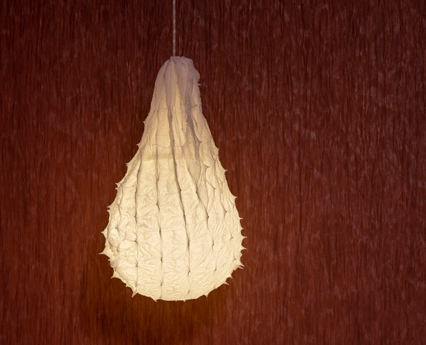 「蜘蛛絞り」の技法を採用。布にしっかり残った絞りの跡と、布の突起が光を拡散して柔らかな印象となります。光と影が見えるよう白い布を用いています。