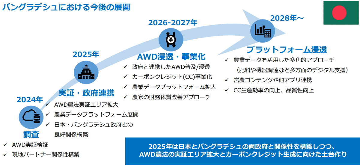 実施エリアを拡大し、農業データプラットフォームの浸透と現地へのAWD農法の普及を進めることで、マイクロファイナンスによる資金調達が可能となる仕組みづくりや、政府機関と連携しカーボンクレジット創出に向けた取り組みや、農家の課題解決を継続して進めてまいります。