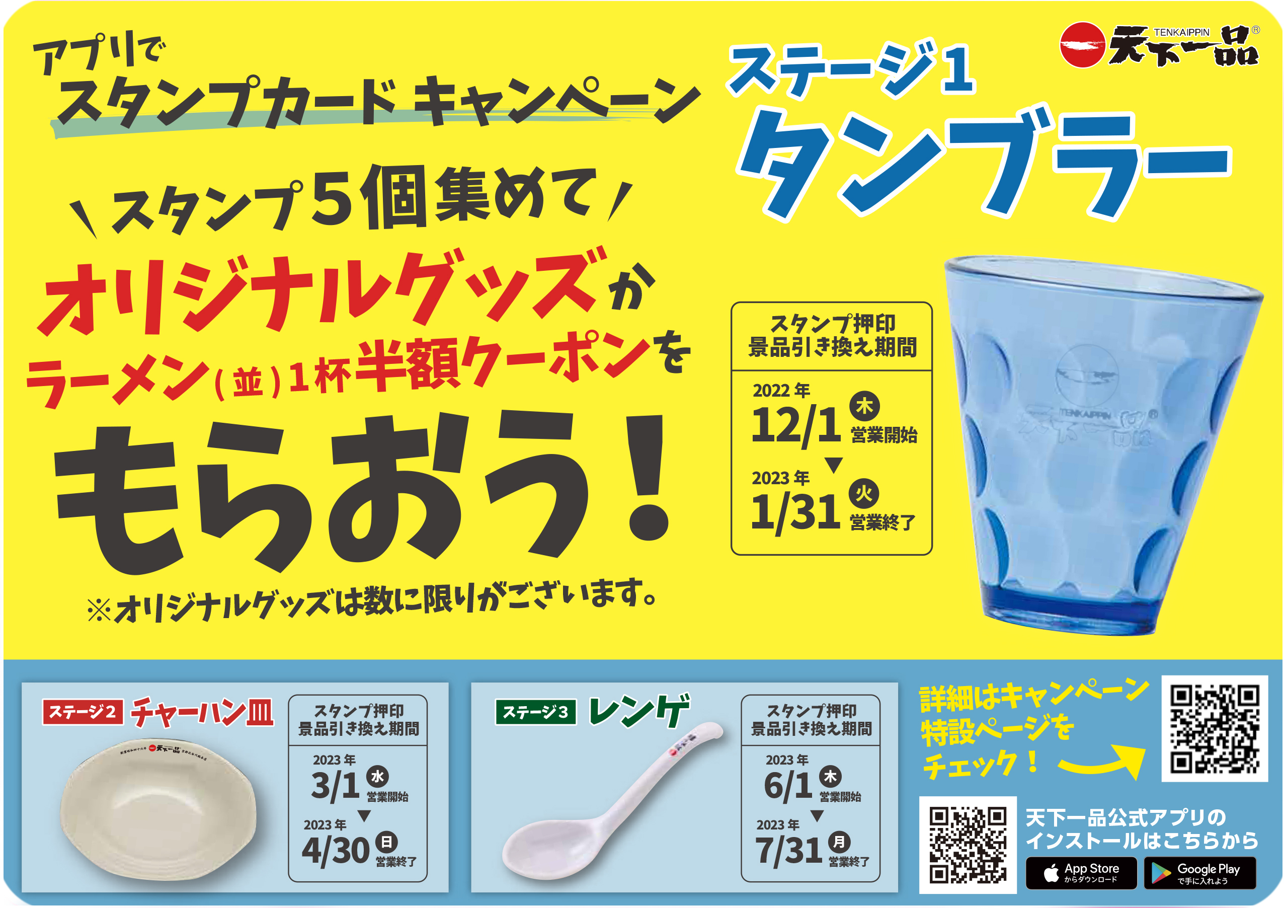 キャンペーン景品は、天下一品公式アプリ内にあるスタンプカードにスタンプを5個集めると、「天下一品オリジナル食器」または、次回ご来店時にご利用いただける「ラーメン(並)1杯半額クーポン」のどちらかをお選びいただけます。