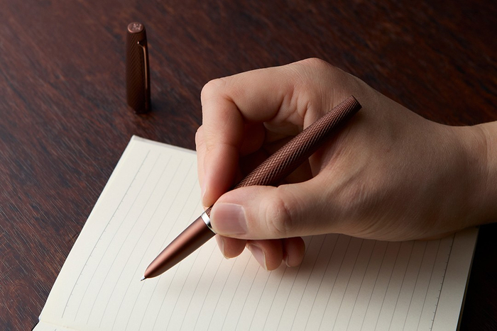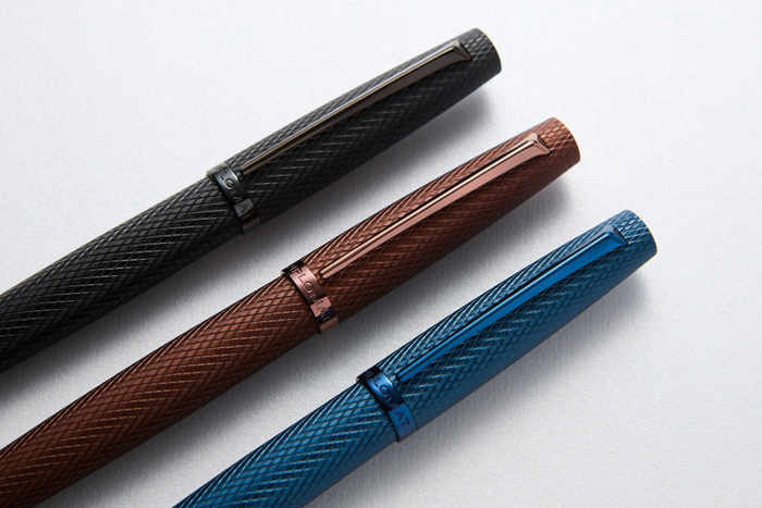 VIPER(バイパー)は、ギロシェパターンの彫刻だけでなく、アノダイズ加工のメタリックな風合いの仕上げとも好相性となっており、流線型のフォルムはボディ、グリップ、そして精緻に設計され滑らかな書き味を発揮するフーデッドニブへと一体感のある曲線を描きます。従来使用していた14金ペン先(エクセレンスA2、アエロなど)をステンレスにすることで価格を抑え、初めての万年筆としても最適なアイテム。機械で代えることの出来ない熟練による手作業で作り上げられたVIPERは、ブラウンの登場により、ブラウン/ブルー/ブラックの3色から自分のスタイルに合わせて選択できるようになります。