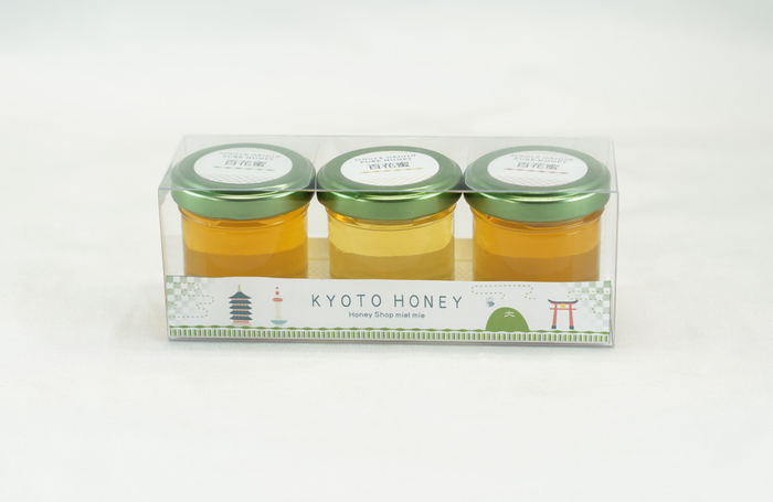 宮津市、京都市大原周辺、京都市上賀茂周辺で採れた蜂蜜(各30g)が3種類セットになったオリジナルパッケージの食べ比べセット。プチギフトやお土産にもピッタリ。販売はミールミィ三条本店・高島屋店、キンイロ伊勢丹京都店のみ。