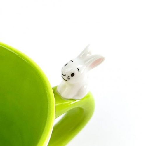 持ち手にうさぎがちょこんとついたマグカップ。内側はマグカップに描かれた草原と同じグリーンカラーです。ジョージはかくれんぼをしているのかな?うさぎが絵本から飛び出したみたいで、とっても賑やか!