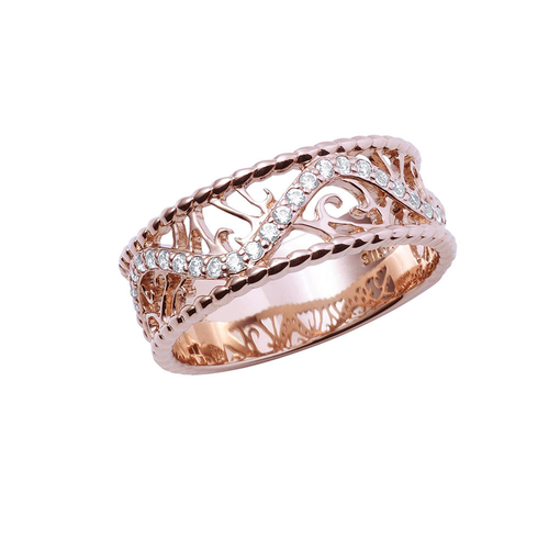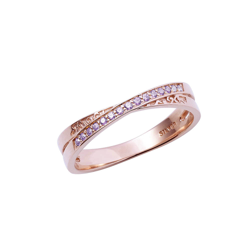 川端の指環(鞭)はレトロなピンクゴールドコーティングを施した透かし柄の型に、イメージカラーストーンをウェーブ状に配しました。手元が華やかになるデザインです。