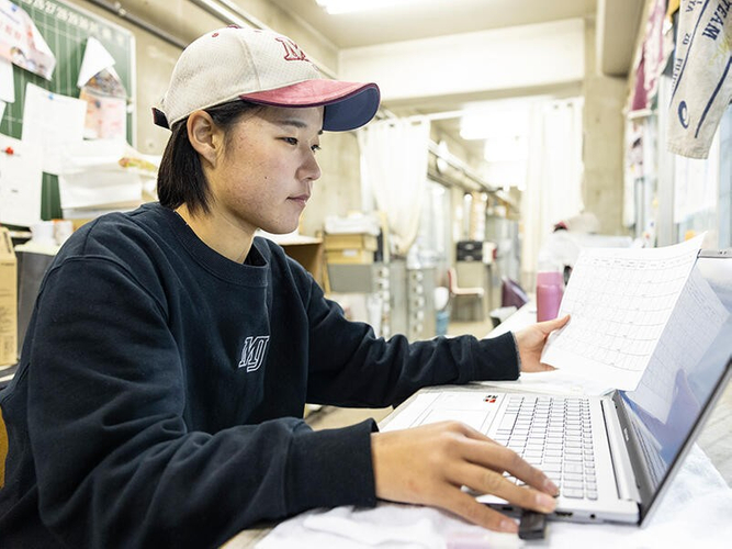 また、監督やコーチと選手間の橋渡し役として、正確な情報を選手に伝えるとともに、選手の状態を把握するために密にコミュニケーションを取っています。チーム全体の成績向上のために、自分に何ができるかを常に考え、広い視野を持って取り組むことを心がけています。