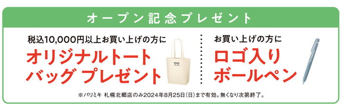 オープンを記念し、税込10,000円以上お買い上げの方に「オリジナルトートバッグ」を、また、期間中お買い上げの方に「ロゴ入りボールペン」をプレゼント!