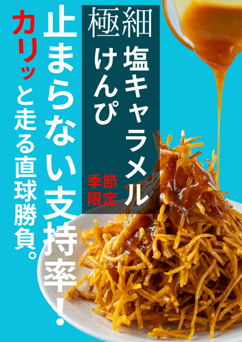 第2回、第3回のお芋総選挙を2連覇した王者「極細けんぴ」からの刺客。極細けんぴシリーズから季節限定の塩キャラメル味が名乗りを上げた!細長く厚さ3mmにカットされた鳴門金時をカリッと揚げ、鳴門の塩とキャラメルを絡めております。店内工房にて手作りで製造しているため1時間に1回の数量限定販売となっています。