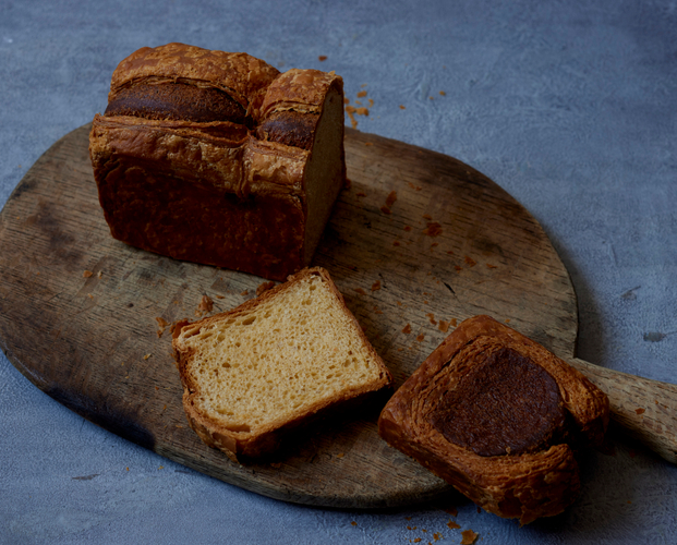 バターたっぷりのブリオッシュをクロワッサン生地で包んだ、当店の代名詞とも言えるヴィエノワズリ。焦がしバターを使い、卵に負けないしっかりとしたバターの香りを表現しました。クロワッサンのサクっとした食感とブリオッシュのシュワっと溶ける口どけを堪能できます。切り分けてそのままはもちろん、トーストして具材をのせたり、挟んだりと様々なアレンジをお楽しみいただけます。エシレでは季節ごとにオリジナル レシピを紹介しています。