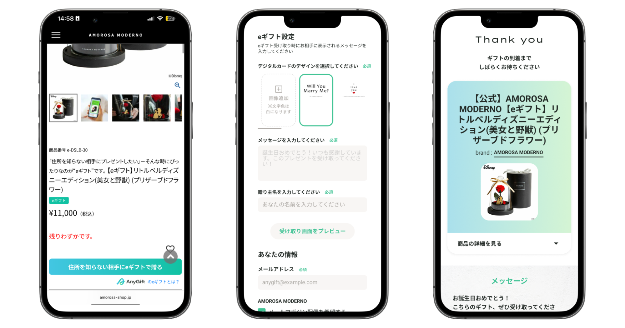 今回、AnyGiftの提供により、「AMOROSA MODERNOオンラインショップ」の人気商品がeギフトとして贈れるようになりました。