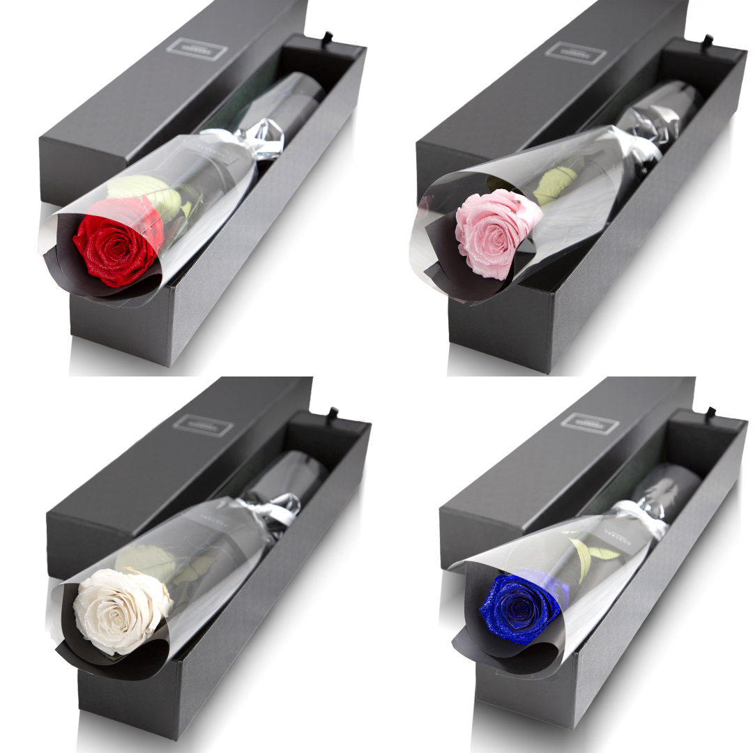 「The ONE(ザ・ワン)」とは、英語で「ただひとりの大切な人」という意味。黒のロングボックスを開けると、天然ダイヤモンドとラメが煌めく大輪のバラが現れます。その輝きが、特別な瞬間を永遠の思い出に変えます。