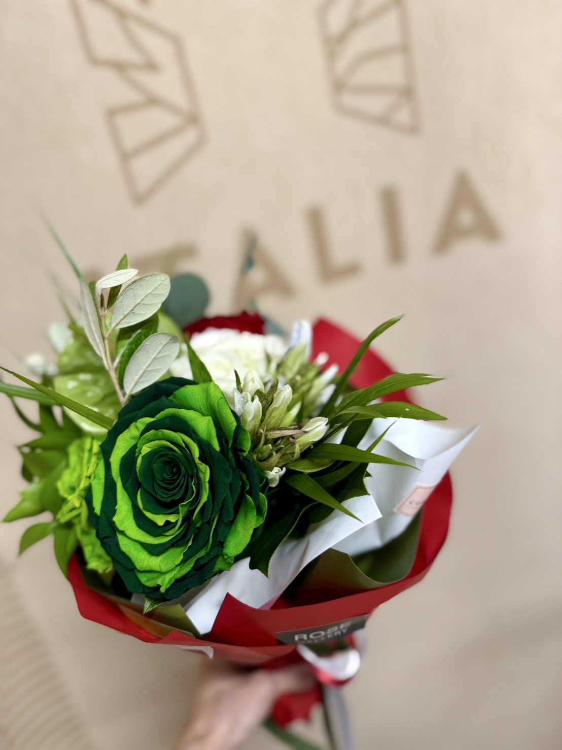 イタリア国旗の赤・白・緑をモチーフにした花束構成により、両国の文化交流における敬意と祝福の意を表現。日本の花文化における美意識を国際舞台で体現いたしました。