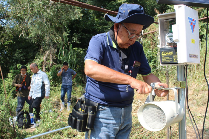 「いのドン」は、理大教育推進機構の辻維周(まさちか)教授が自動車部品メーカーと開発。この日、辻教授は地元住民の協力を得て、島中央部の尾根の獣道に設置。その近くに高周波音でシカなどを撃退する「ハイパー鹿ソニック」を据えました。ハイパー鹿ソニックは従来の「鹿ソニック」の周波数帯を広げ、到達範囲・放射角を拡張したもので、イノシシへの効果も検証するために設置しました。