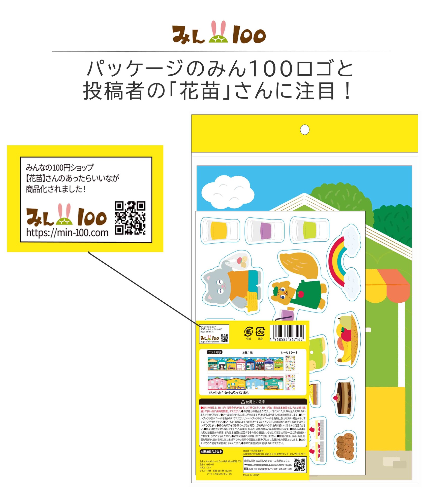 みん100株式会社(本社:京都府京都市、代表取締役:池田 大介)は、生活者の声をもとに100円ショップ向けの商品を共創するWEBサービス「みん100」に寄せられた消費者様の声を元に株式会社元林様とジャバラ型の子ども向けシールブック「大きなシールブック 横長 街とお部屋づくり」を共同開発し、全国の100円ショップにて販売開始いたしました。