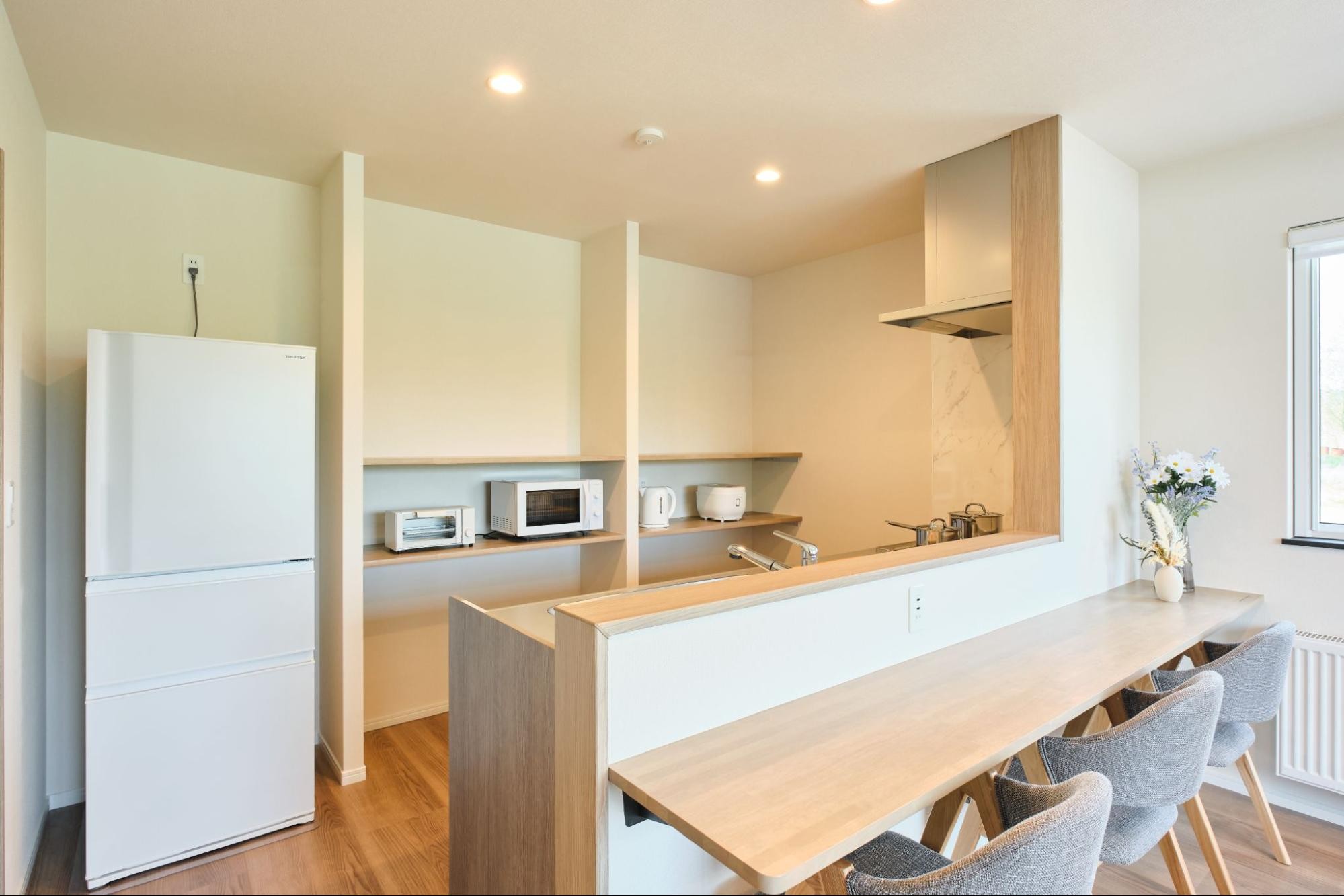 趣の異なる複数の寝室(全4室)は、それぞれのプライベートを確保します。 また、充実した設備は「暮らすような滞在」を実現します。グループ全員で料理を楽しめる最新設備の広々としたアイランドキッチン(3口IHコンロ、調理器具・食器類完備)、快適なバスルーム、各階に設置されたウォレット付きトイレはもちろん、乾燥機能付きドラム式洗濯機も備え、長期滞在のニーズに完全対応しています。 さらに、高速無料Wi-Fiと、簡単な作業やお仕事にも集中できるデスクスペースも完備しており、中富良野の自然の中で行う快適なワーケーションの拠点としても最適な設計となっています。
