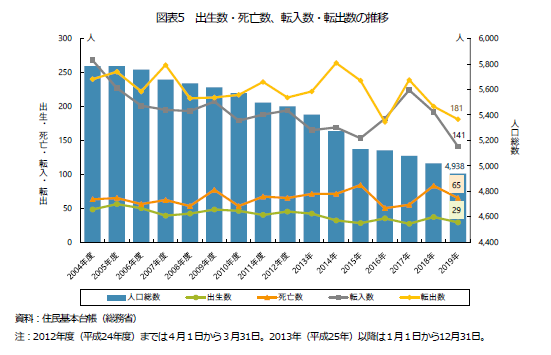 死亡数が出生数を上回る「自然減」に加え、転入数よりも転出数が上回る「社会減」が概ね続いています。特に、就職や進学期にあたる女性の10代・20代、および男性の20代・30代の転出超過が顕著です。
