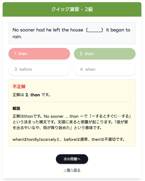 「クイック演習」は、1問1答形式でサクサク進められるトレーニングモードです。解答を送信すると、即座に正誤判定と詳しい解説が表示されるため、通学中や就寝前などの“隙間時間”を最大限に活用し、効率的に学習を進めることができます。