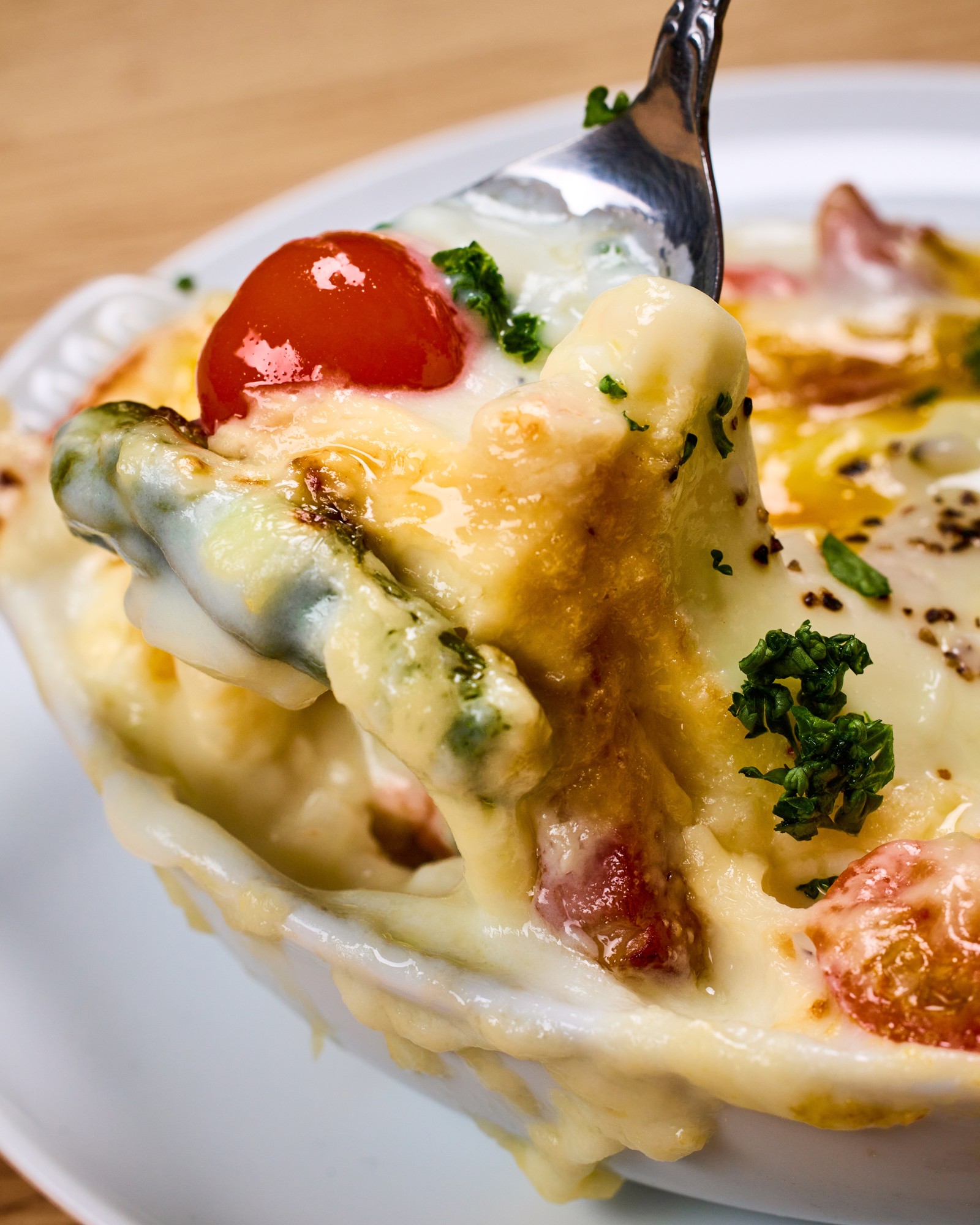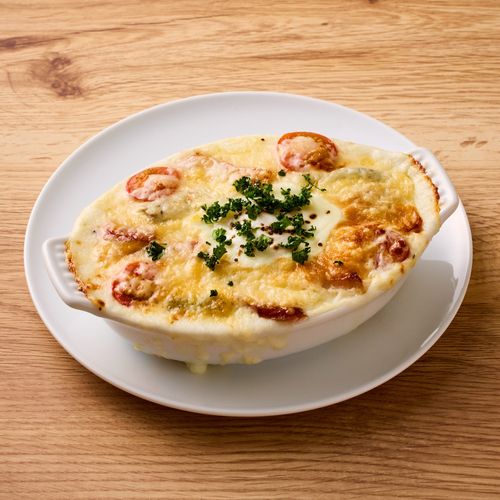 桜のチップで燻製した、香り豊かでジューシーなあらびきウインナーと、ブロックベーコンをカットして香ばしく焼き上げ、アスパラとミニトマトを乗せました。最後にたっぷりのチーズをかけてこんがりと焼き、ベシャメルソースや半熟たまご、ライスと絡まり絶妙な美味しさを奏でます。