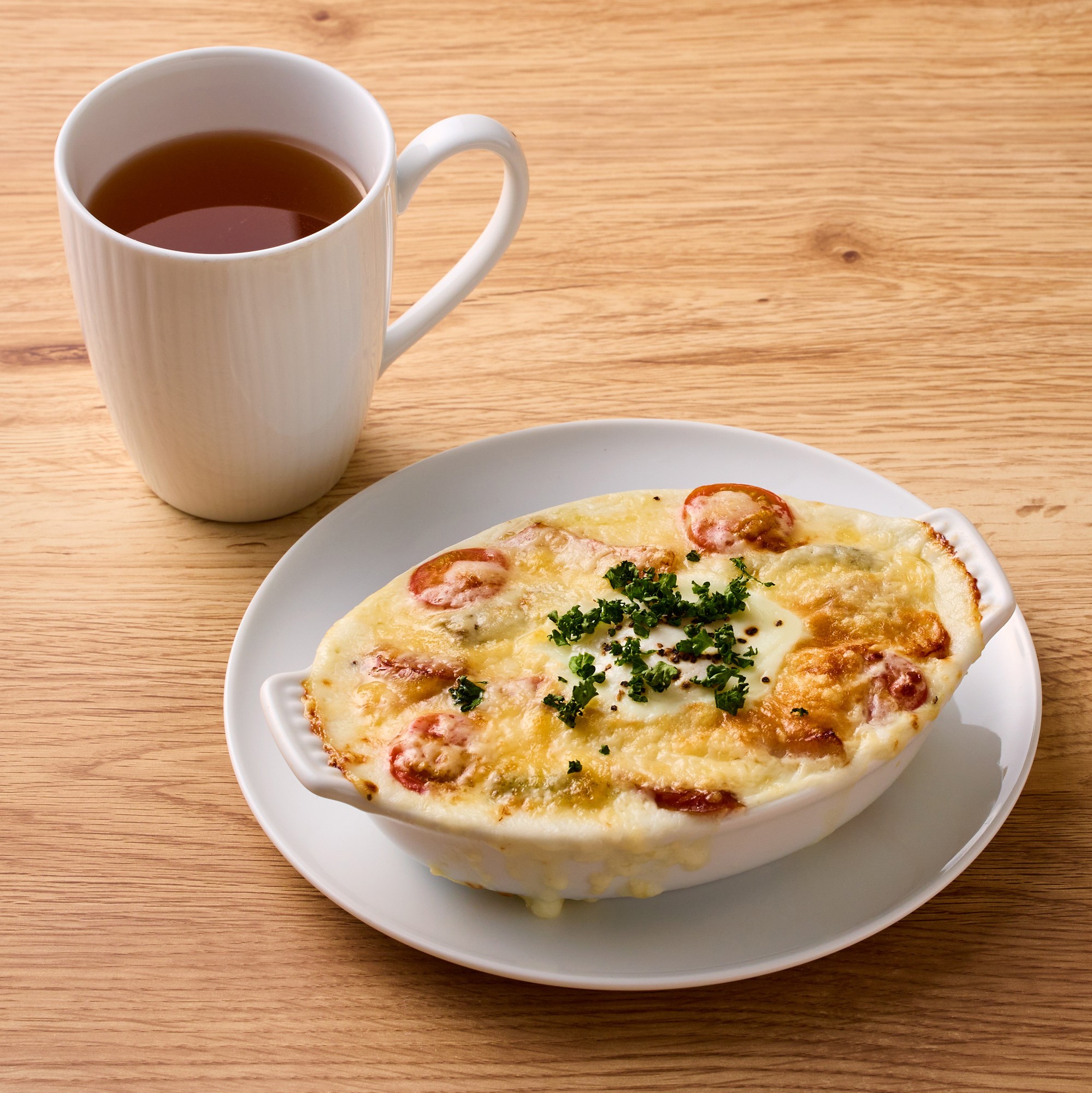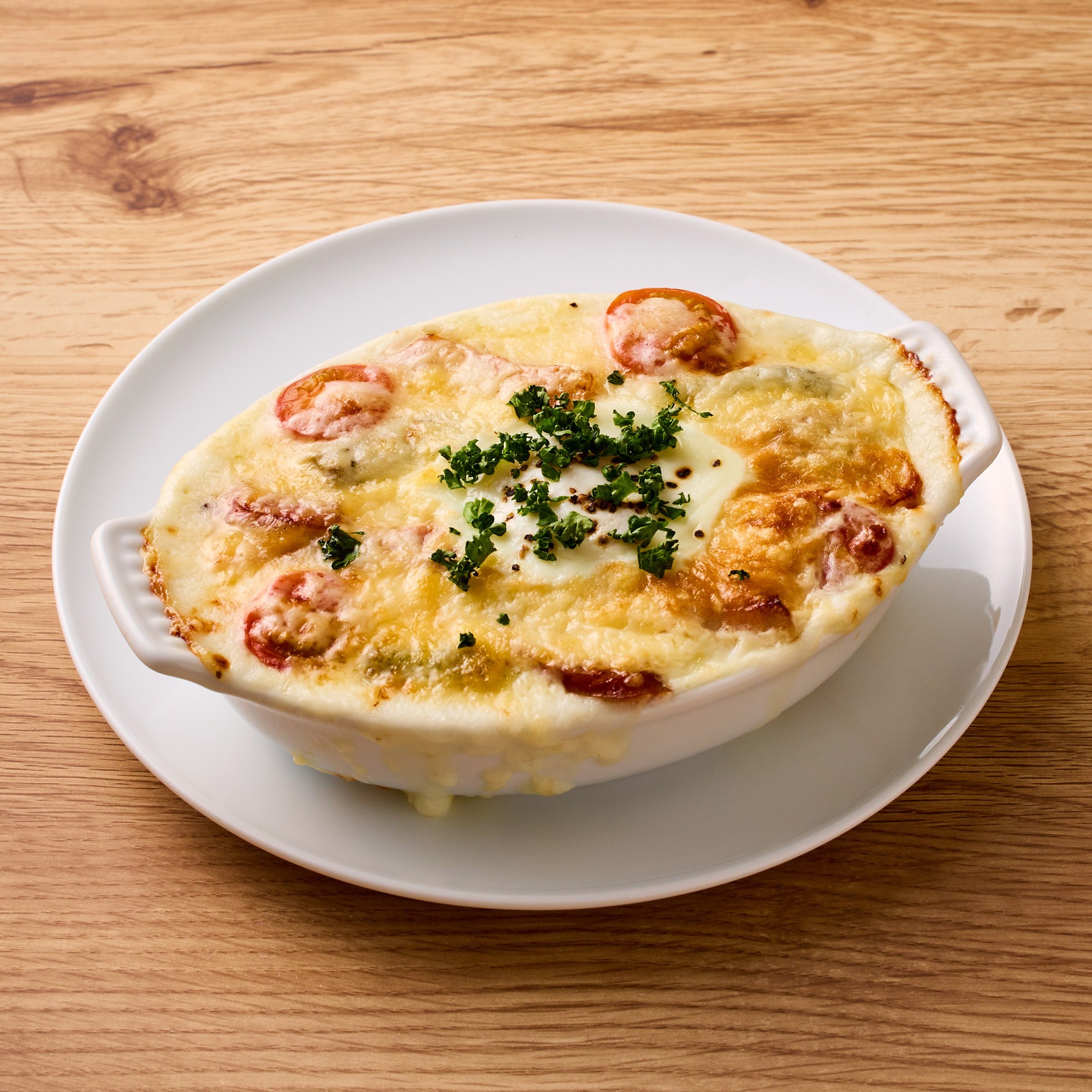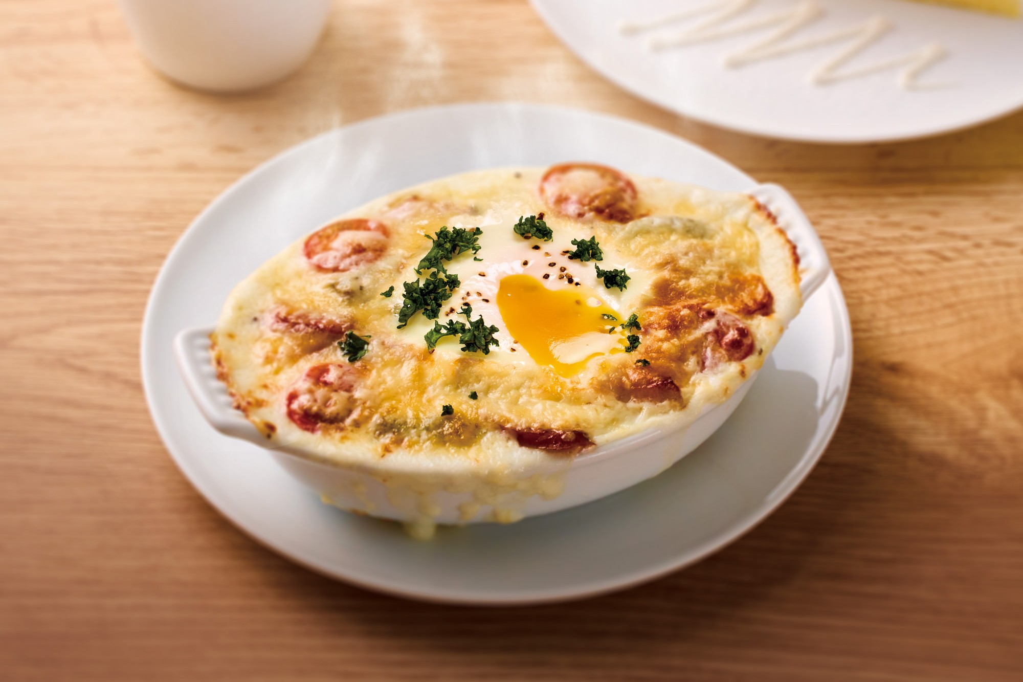 北海道蘭越町産ゆめぴりかを使用したバターライスになめらかな放牧牛乳のベシャメルソースをたっぷりとかけ、香ばしく焼き上げたベーコンとウインナーにミニトマト、アスパラを飾り、チーズをたっぷりとかけてこんがりと焼き上げました。真ん中のたまごを割るととろりと半熟たまごがとろけ出します。